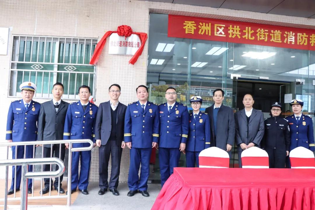 消防車廠家【www.buy24online.com】新聞訊:廣東省珠海市香洲區拱北街道消防救援分局在街道第二辦公樓揭牌亮相,標志著廣東省首個消防救援分局正式建成。省消防救援總隊劉勝高級工程師、市消防救援支隊李汕支隊長、香洲區劉齊英區長和市、區兩級住建、應急、公安、司法等部門領導以及消防指戰員代表共100人參加儀式。